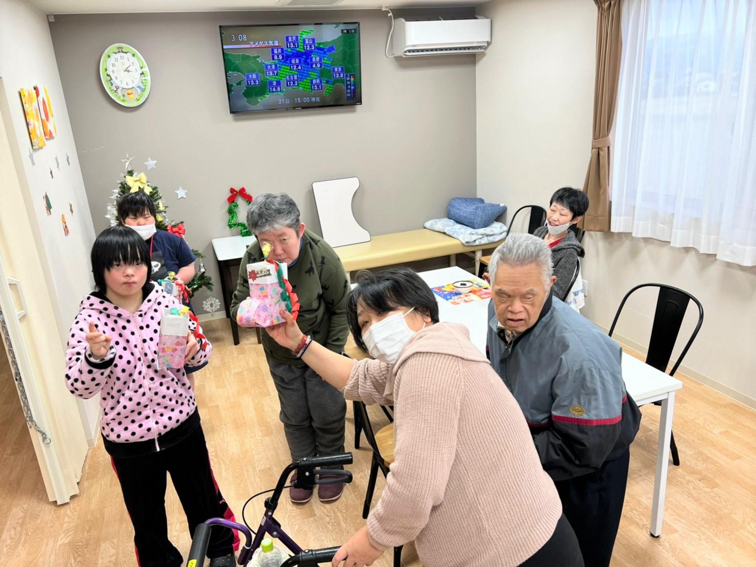 利用者さんと協力して作ったプレゼントボックスにお菓子を詰め込んでお届けです。